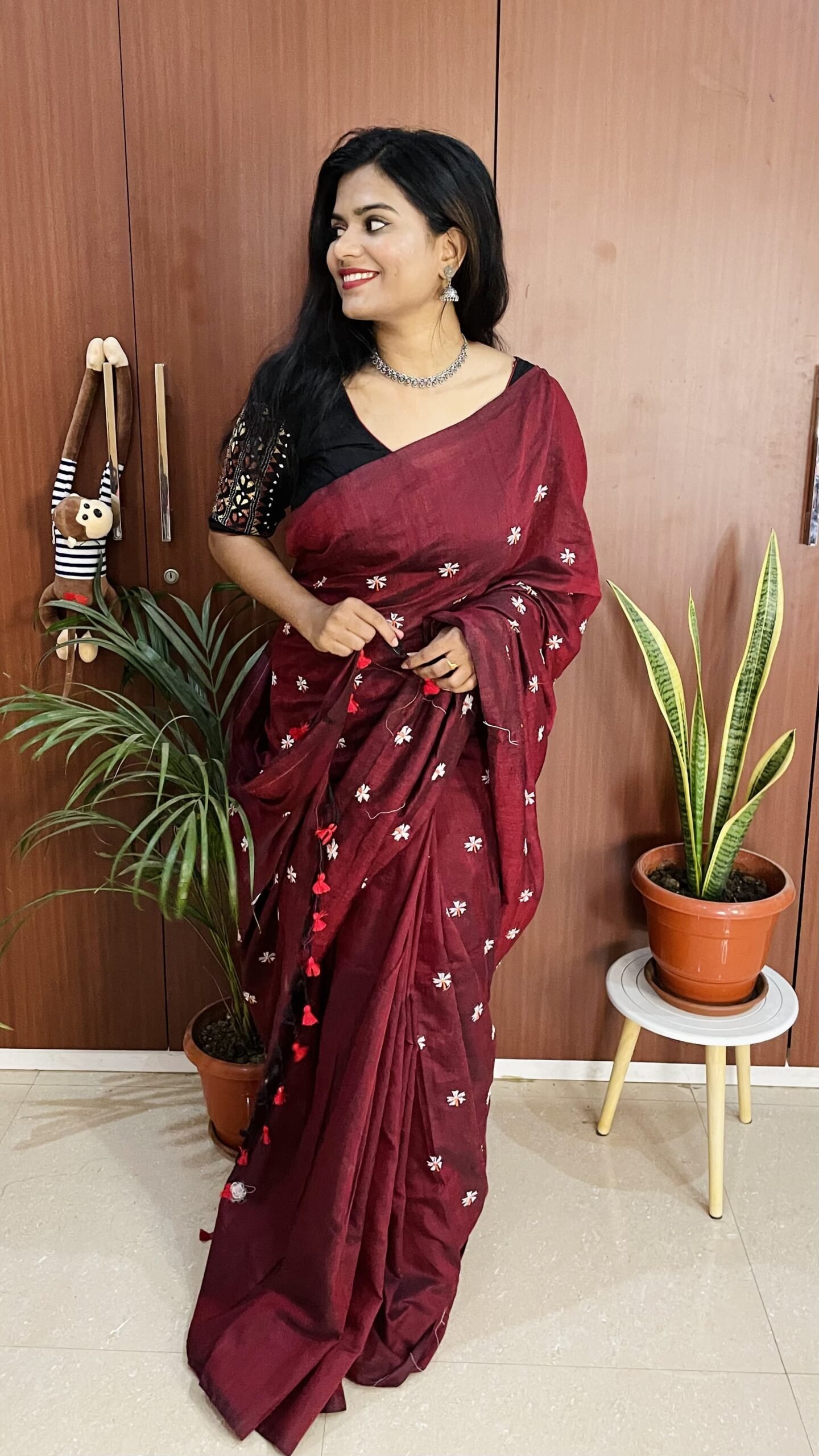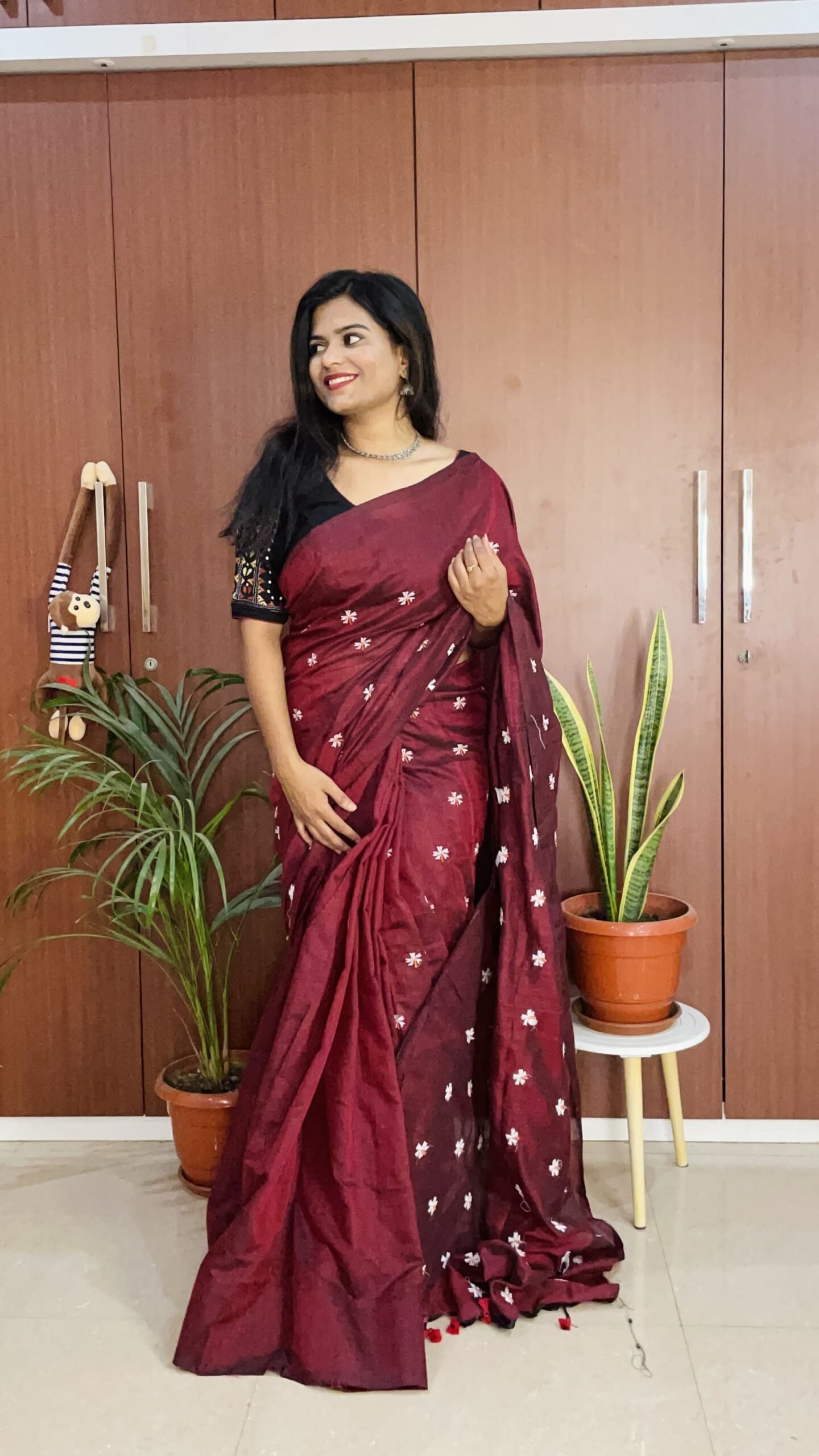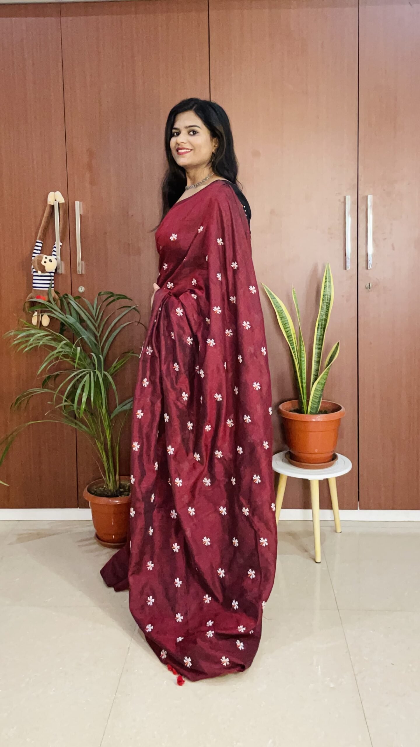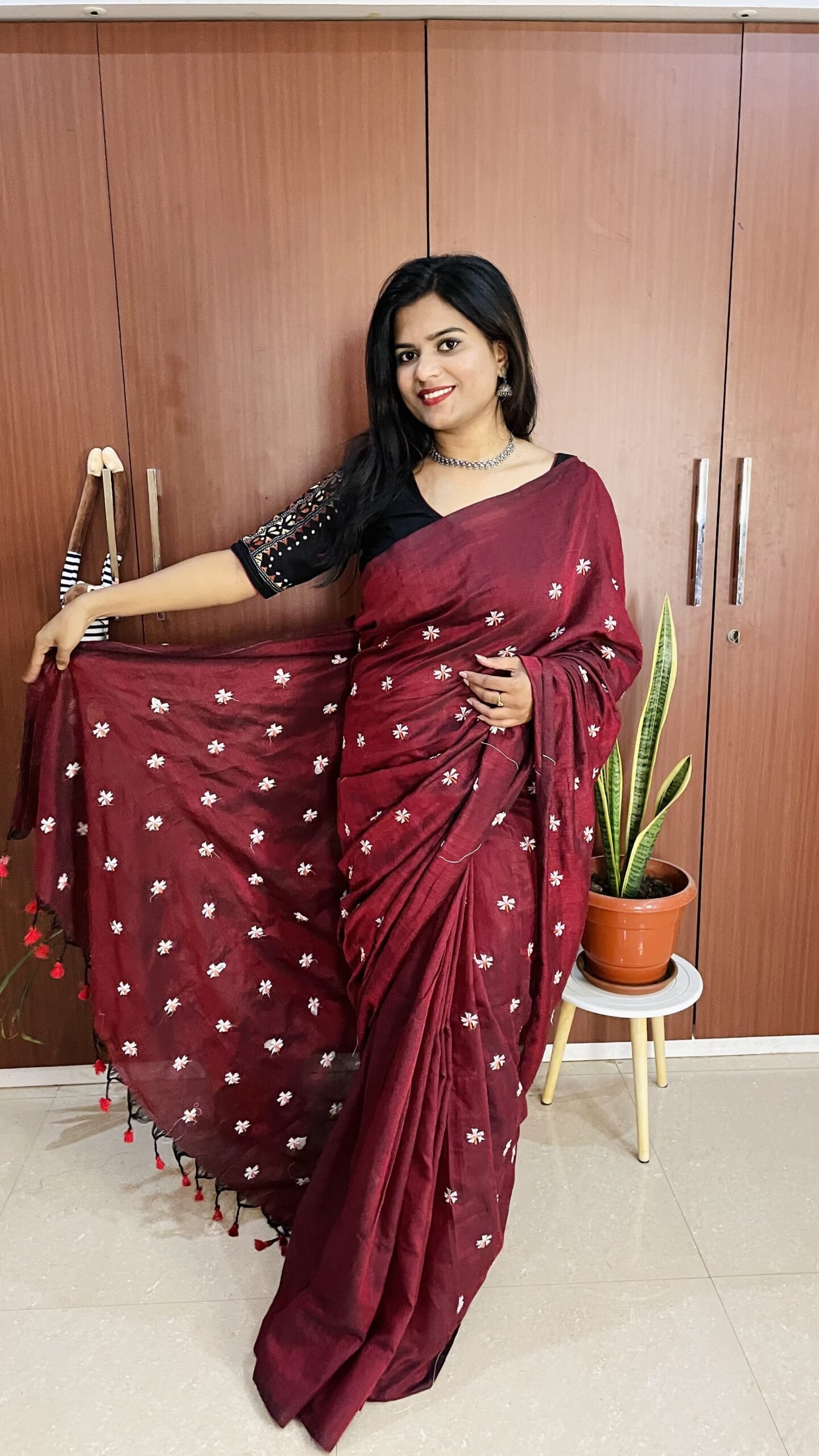 Deep wine-maroon base with dainty white hand-embroidered floral butis.