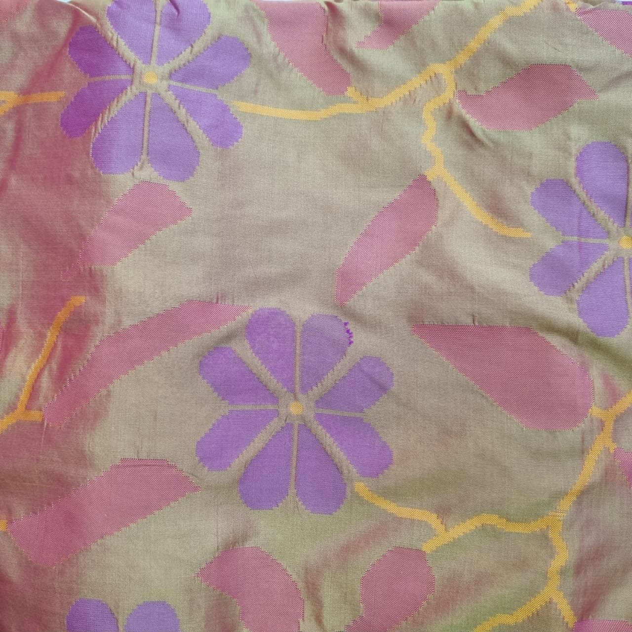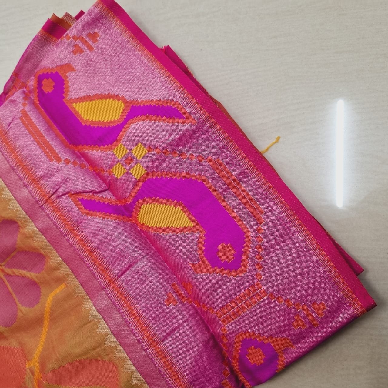 - Vibrant Rani Pink Pallu: Features a stunning fuchsia/rani pink pallu, intricately woven with traditional bird (likely parrot or peacock) motifs in contrasting yellow and purple.