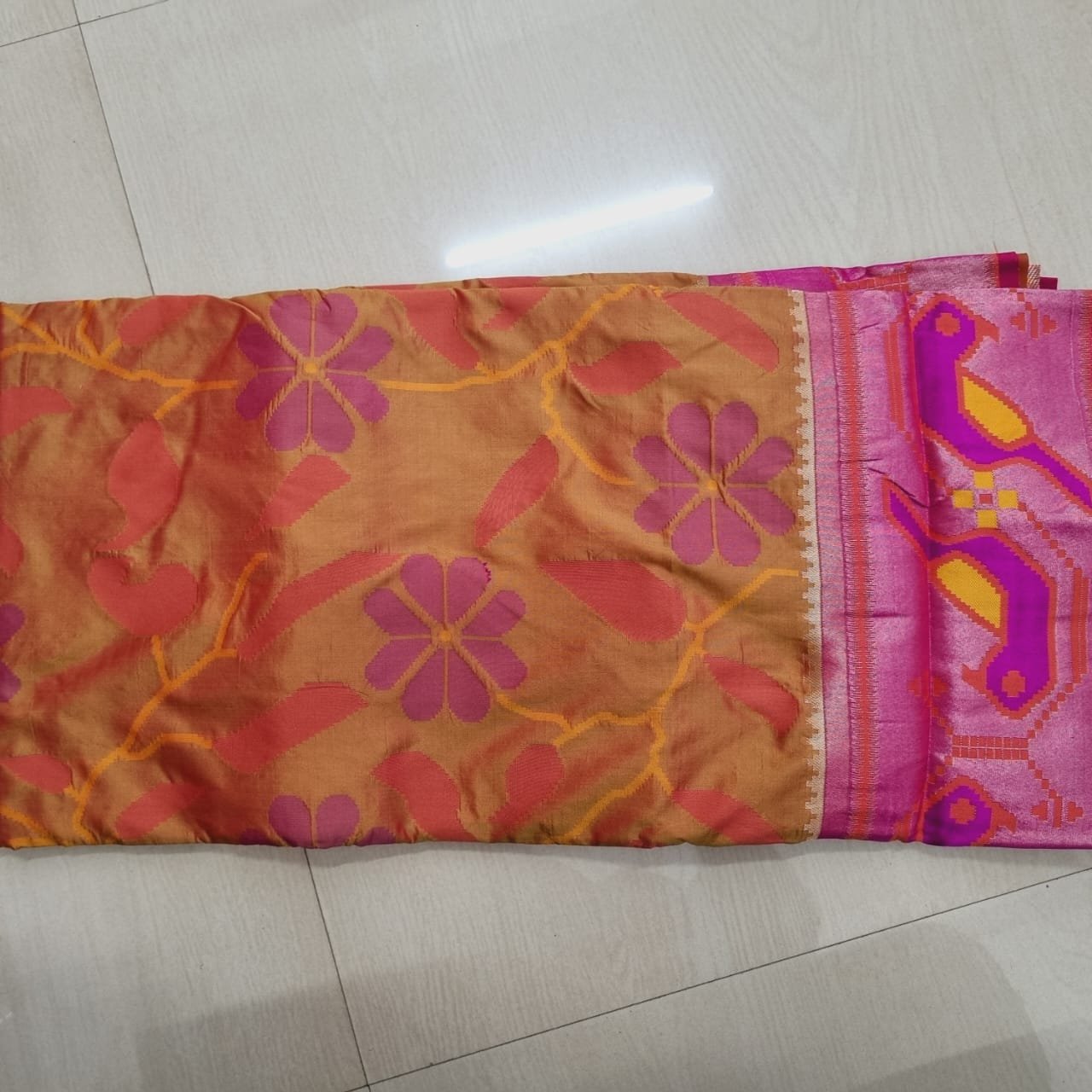 - Radiant Orange Body: The saree’s body boasts a warm, inviting orange hue, creating a captivating backdrop.
