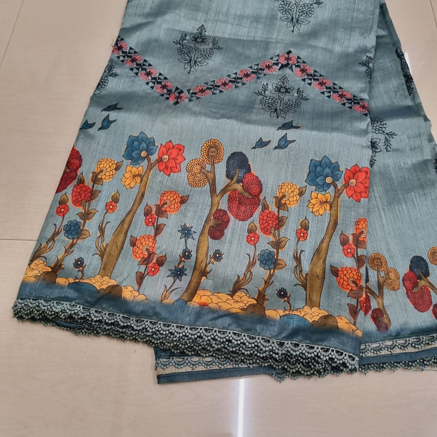 - Delicate Embroidered & Printed Details: The body and geometric patterns incorporate elegant black outlined floral bunches and geometric designs, beautifully enhanced with subtle embroidery over the printed outlines, adding texture and depth.