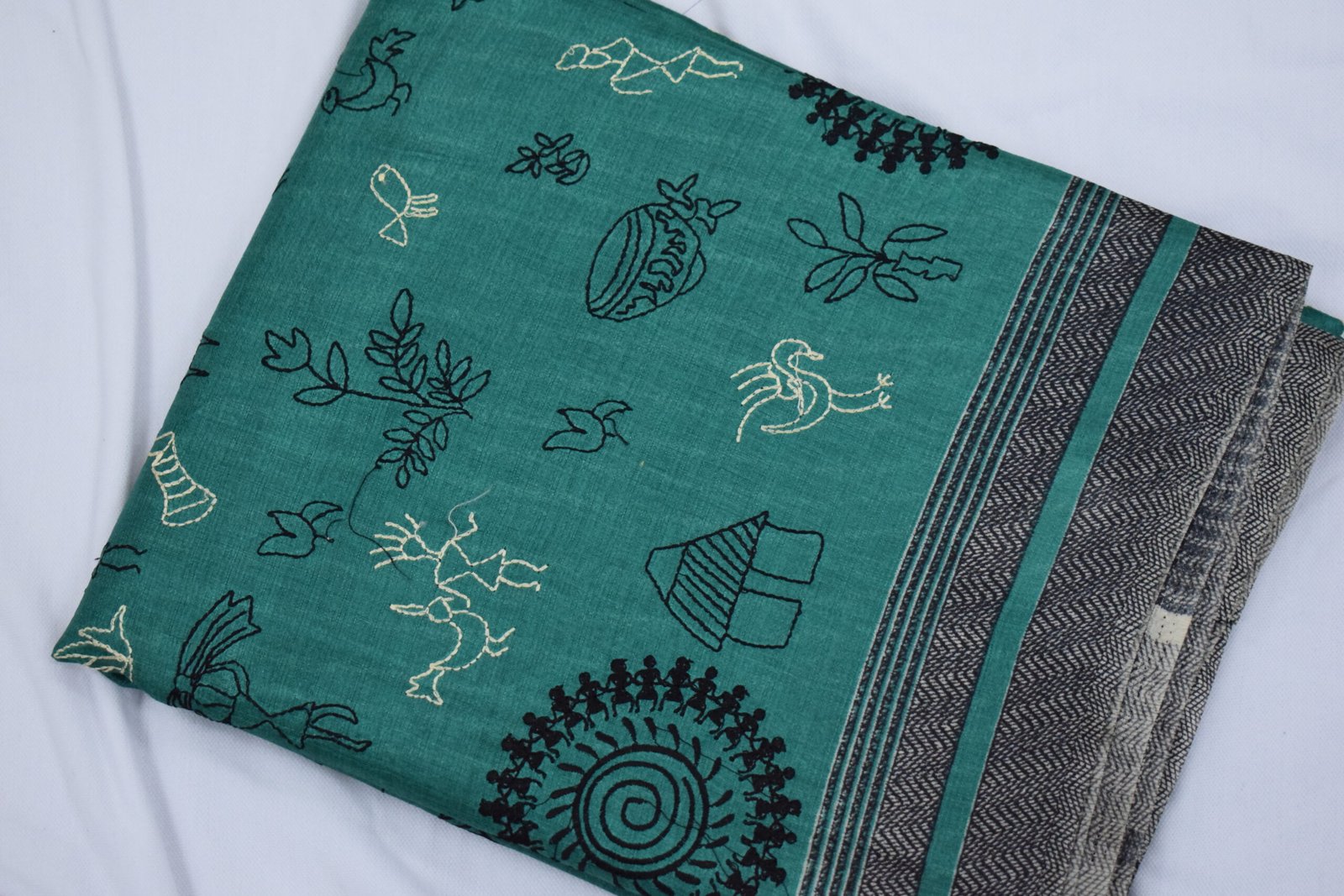 - Calm Greyish-Blue Base: The saree boasts a sophisticated greyish-blue background that allows the colorful motifs to stand out vividly.