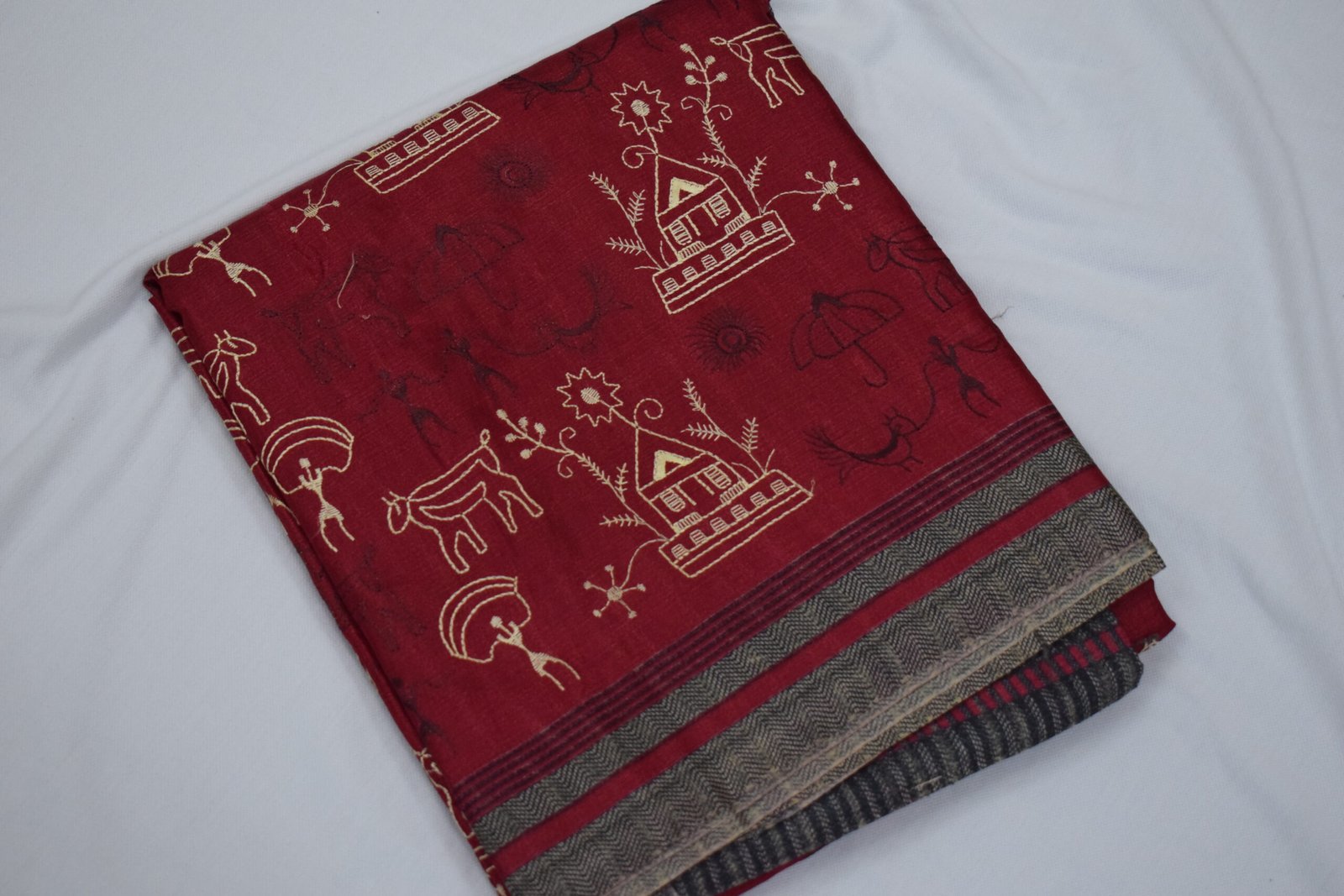 - Distinct Outline Embroidery: The saree is adorned with unique outline embroidery in a contrasting lighter shade (cream/gold), forming intricate motifs of traditional houses, graceful cattle, and stylized human figures scattered across the body.
