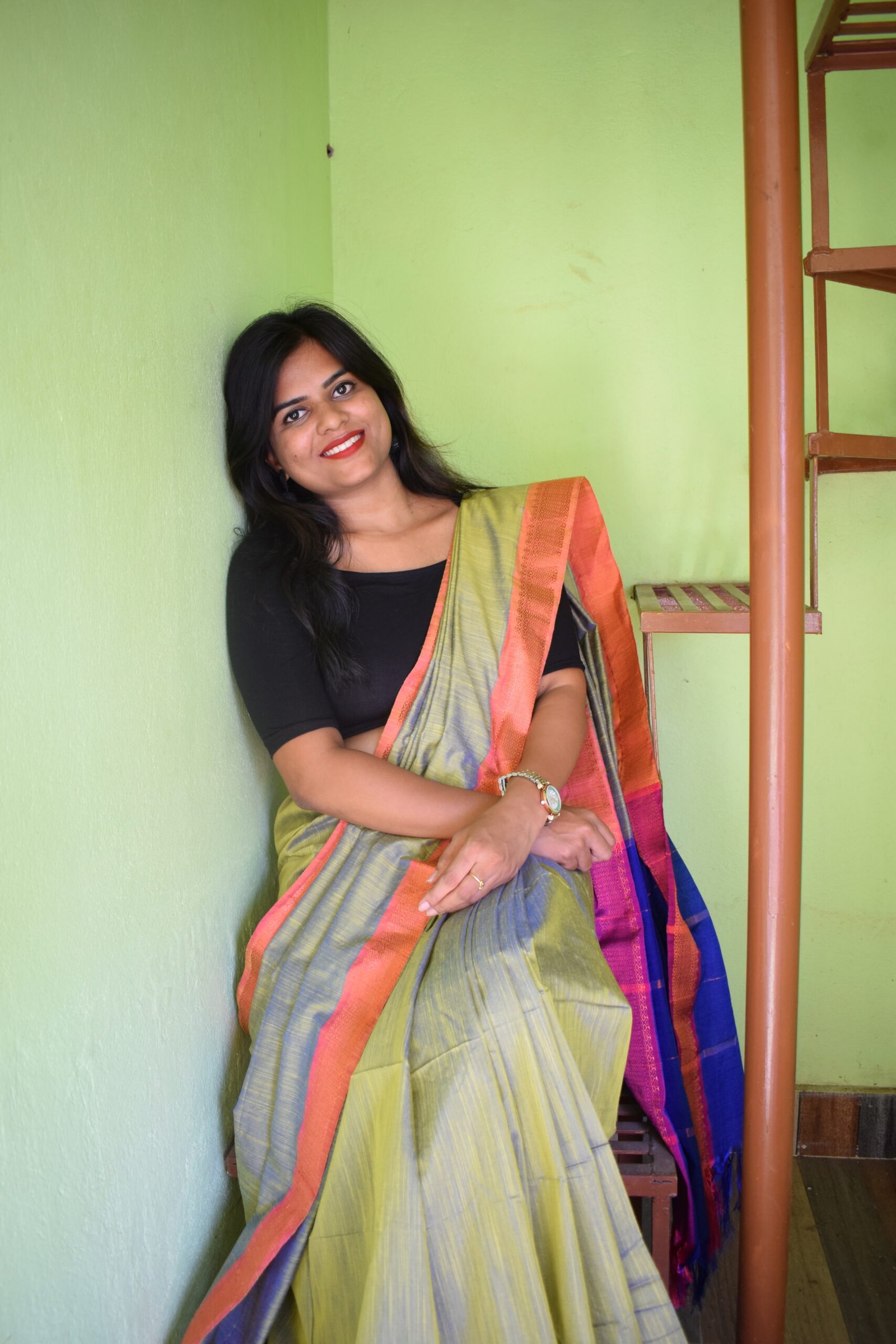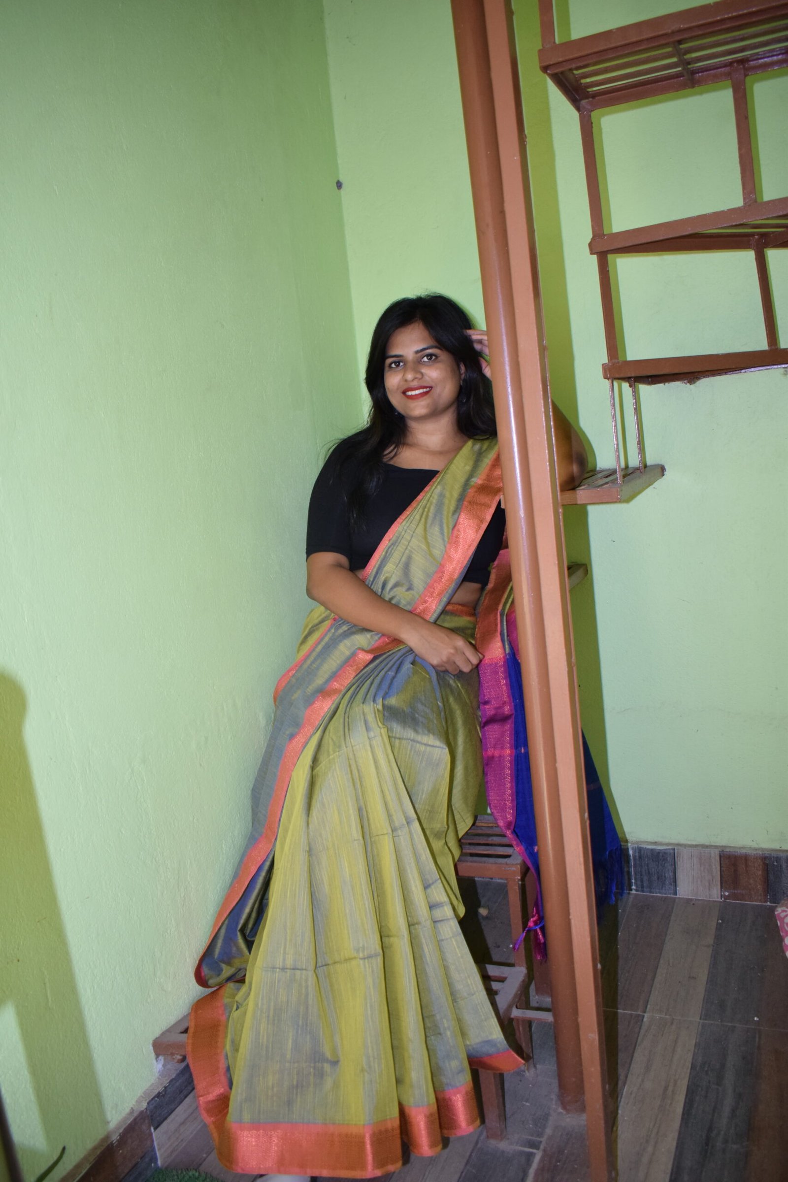 - Vivid Blue Pallu: The pallu or a significant section of it is in a rich, contrasting blue, providing a captivating finish.