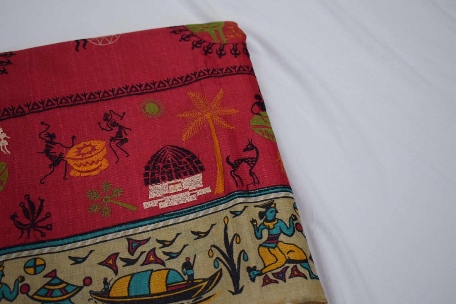 - Distinctive Borders: The saree is framed by elegant cream/beige borders, also featuring intricate embroidered figures and geometric patterns, complementing the main body’s design.