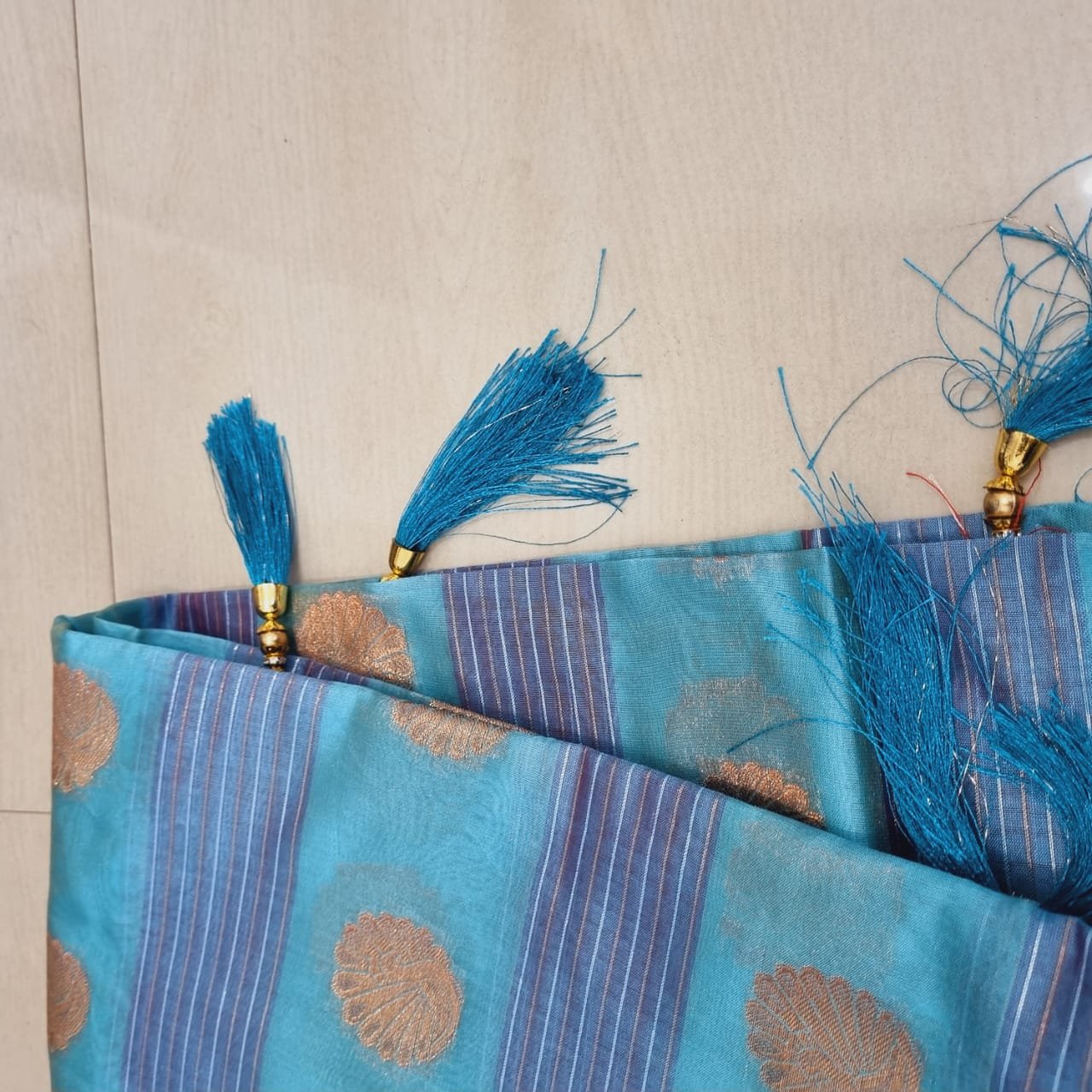 - Vibrant Tassels: Finished with playful and vibrant blue tassels at the pallu end, enhancing its ethnic charm.