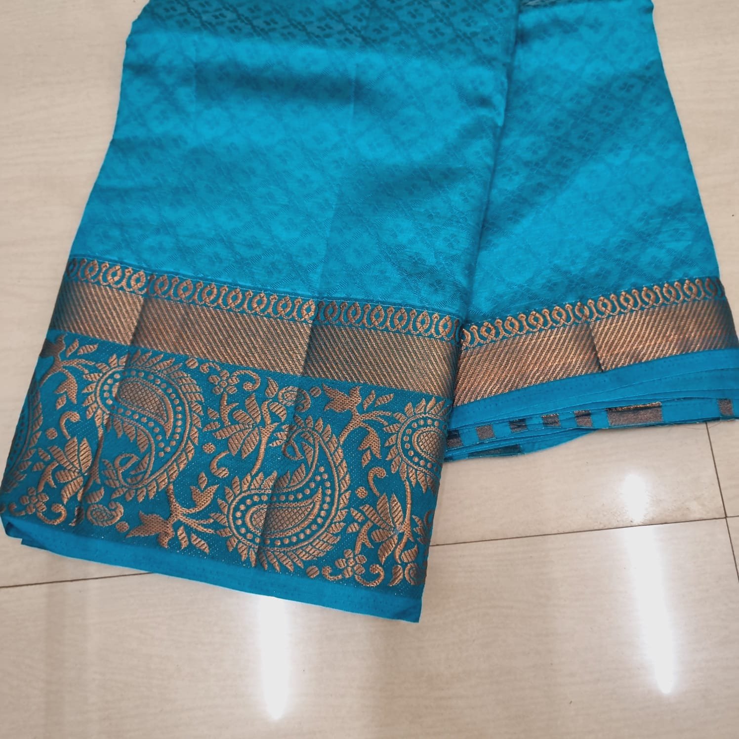 Ornate golden zari border featuring traditional paisley and floral patterns