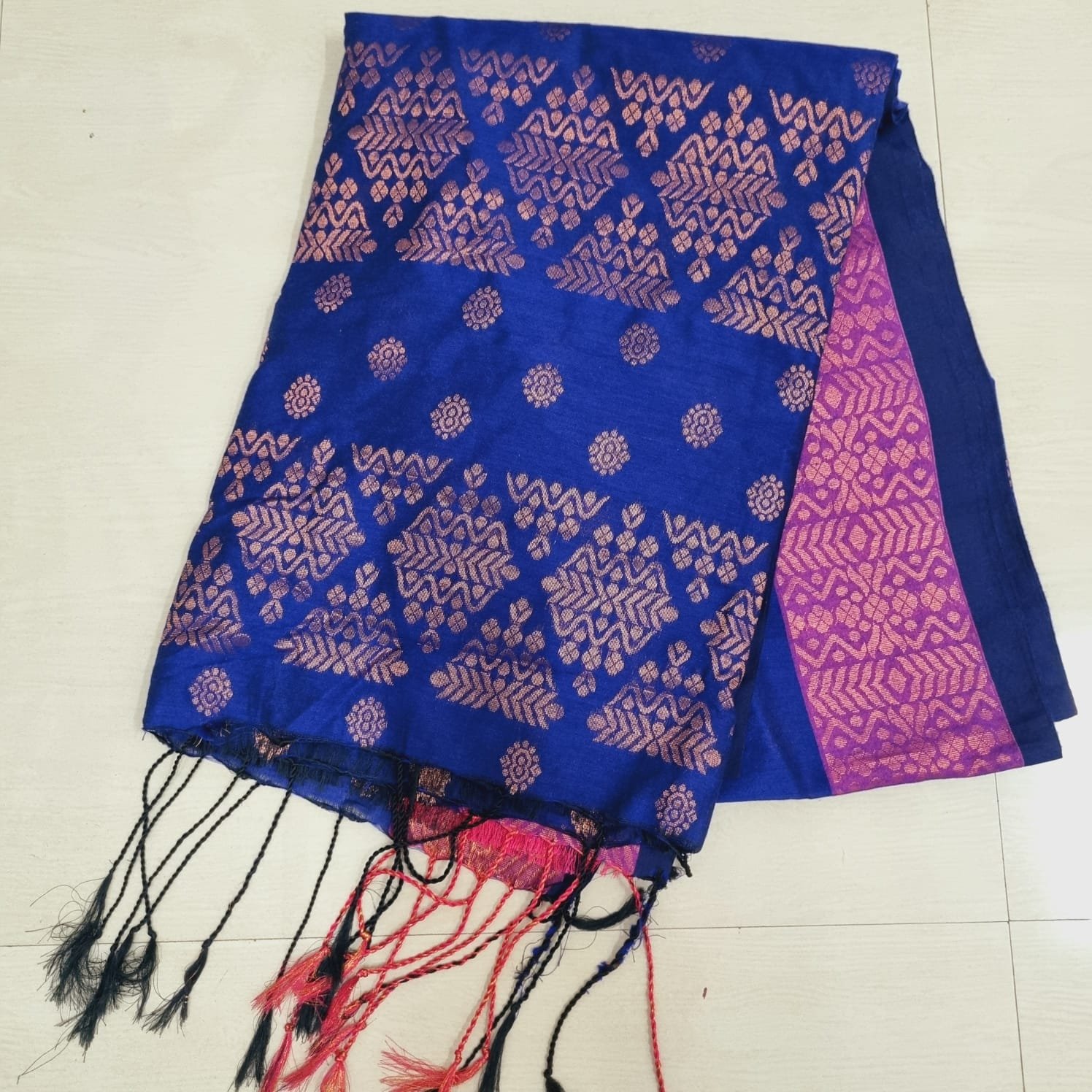 Handcrafted dual-colored tassels for a playful finish on the pallu