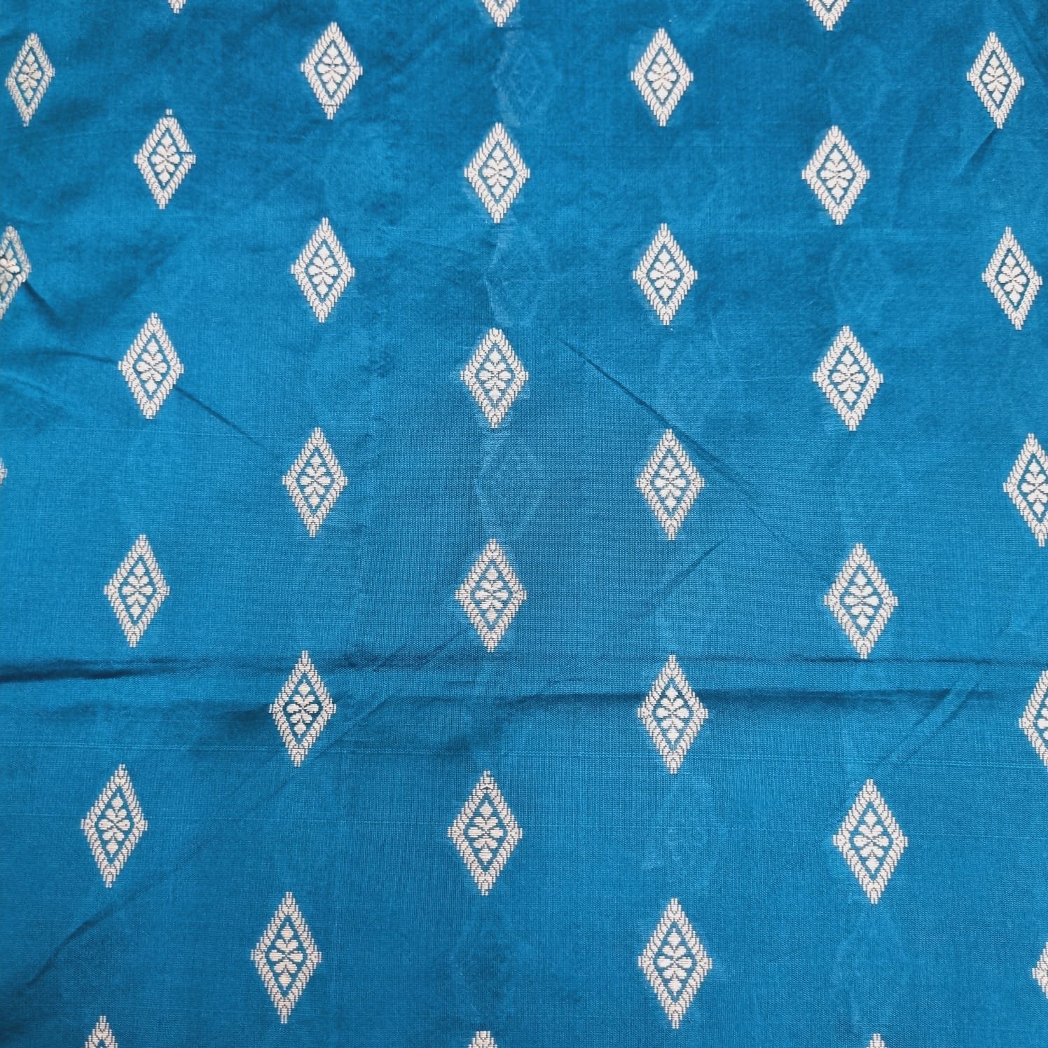 Deep navy blue base with traditional white diamond motifs (Bandha butis)